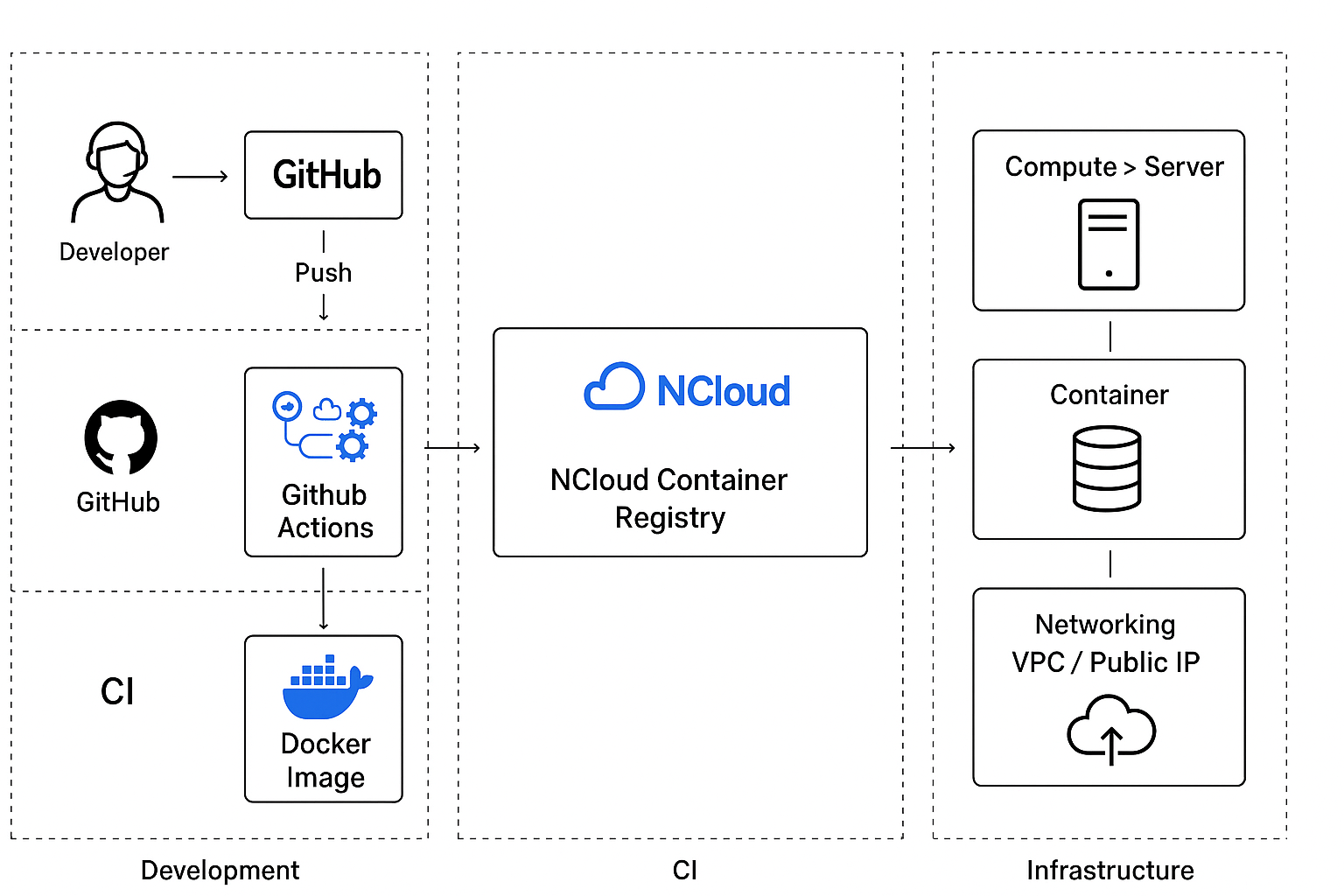 NCP 를 활용했고, 인프라 구축과 배포 환경은 최대한 자동화된 방식으로 할 수 있도록 다음과 같이 적용했습니다.